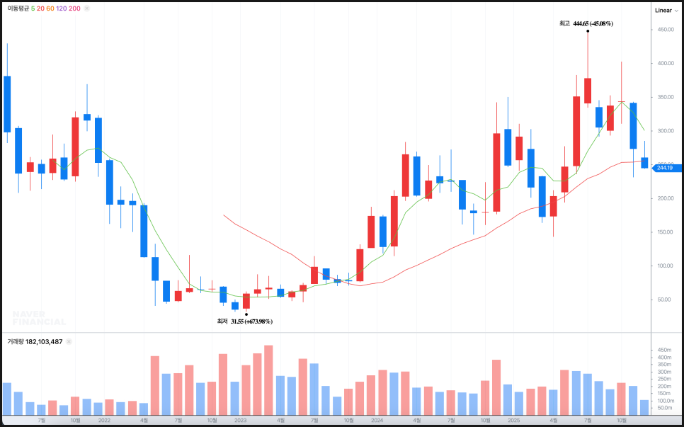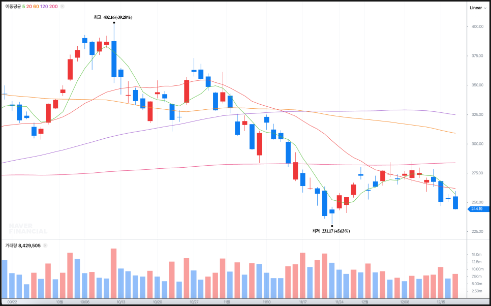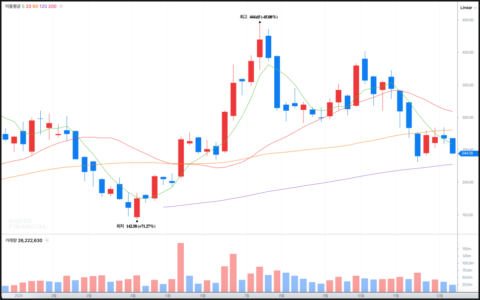주봉으로 내려오면 분위기가 조금 더 보수적으로 보입니다. 고점을 찍은 뒤 반등 시도는 있었지만, 고점이 점점 낮아지는 흐름이 이어지고 있고, 초록색 5주선이 빨간색 20주선과 60주선 아래에서 눌리는 모습입니다. 중기적으로 매도 우위가 유지되고 있다는 신호입니다. 다만 주가가 120주선 위에서는 아직 버티고 있어서, 구조적으로 완전히 무너졌다고 보기는 어렵습니다. 지금 주봉 위치는 추세 반전보다는 방향을 결정하는 구간에 가깝습니다.