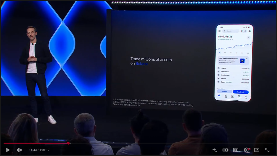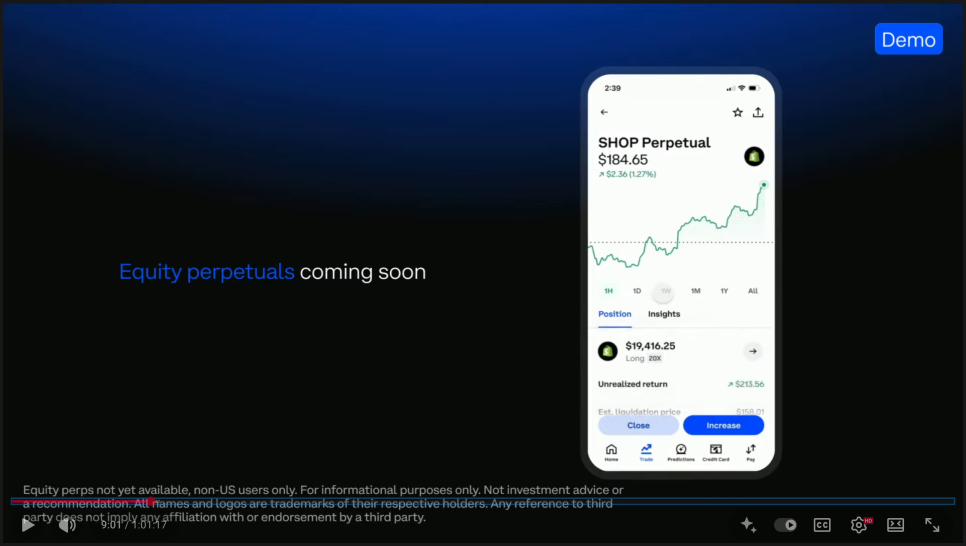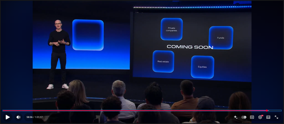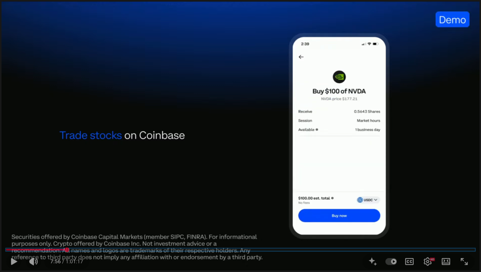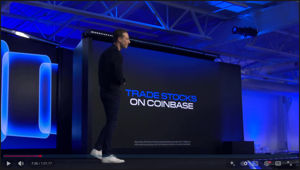이어서 코인베이스의 컨슈머 프로덕트 총괄이 무대에 올라, 이번 업데이트에서 가장 현실적인 변화라고 할 수 있는 주식 거래 기능을 설명하기 시작했습니다. 이제 코인베이스 앱 안에서 암호화폐뿐만 아니라 일반 주식도 직접 사고팔 수 있다는 겁니다.