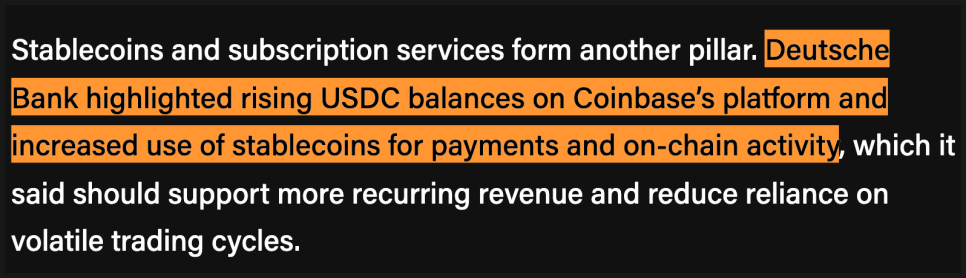 스테이블코인과 구독형 서비스도 또 하나의 축입니다. 도이치은행은 코인베이스 플랫폼 내 USDC 잔고가 증가하고 있고, 결제나 온체인 활동에서 스테이블코인 활용도가 높아지고 있다는 점에 주목했습니다. 이는 거래량 변동에 따라 실적이 출렁이던 기존 구조에서 벗어나, 보다 반복적이고 안정적인 매출 기반을 만들 수 있다는 의미입니다.