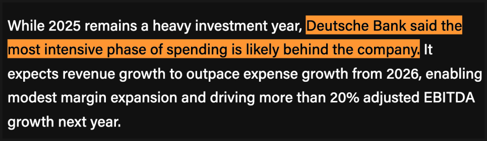 비용 구조에 대한 평가도 상대적으로 긍정적입니다. 2025년까지는 투자 부담이 큰 해로 보지만, 가장 공격적인 투자 국면은 이미 지나가고 있다고 판단했습니다. 2026년부터는 매출 성장률이 비용 증가 속도를 웃돌면서, 마진이 소폭 개선되고 조정 EBITDA 기준으로 20% 이상의 성장도 가능할 것으로 내다봤습니다.