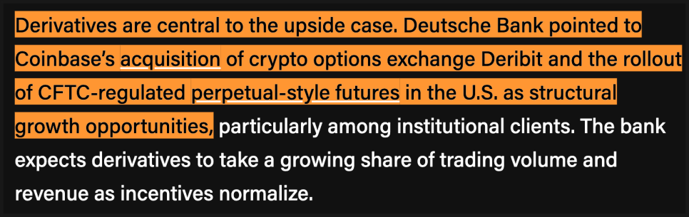 특히 파생상품이 가장 중요한 성장 동력으로 지목됐습니다. 도이치은행은 코인베이스가 암호화폐 옵션 거래소 데리빗(Deribit)을 인수한 점과, 미국에서 상품선물거래위원회(CFTC) 규제를 받는 무기한 선물 상품을 출시한 점을 구조적인 성장 기회로 평가했습니다. 기관 투자자 비중이 높은 파생상품 특성상, 거래량과 수익 기여도가 점점 커질 가능성이 높다는 판단입니다. 장려금이나 프로모션이 정상화되면 수익성도 개선될 수 있다고 봤습니다.