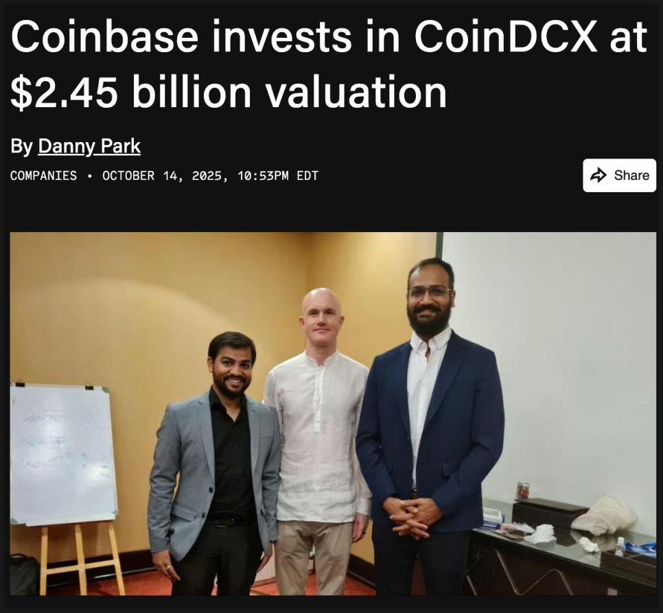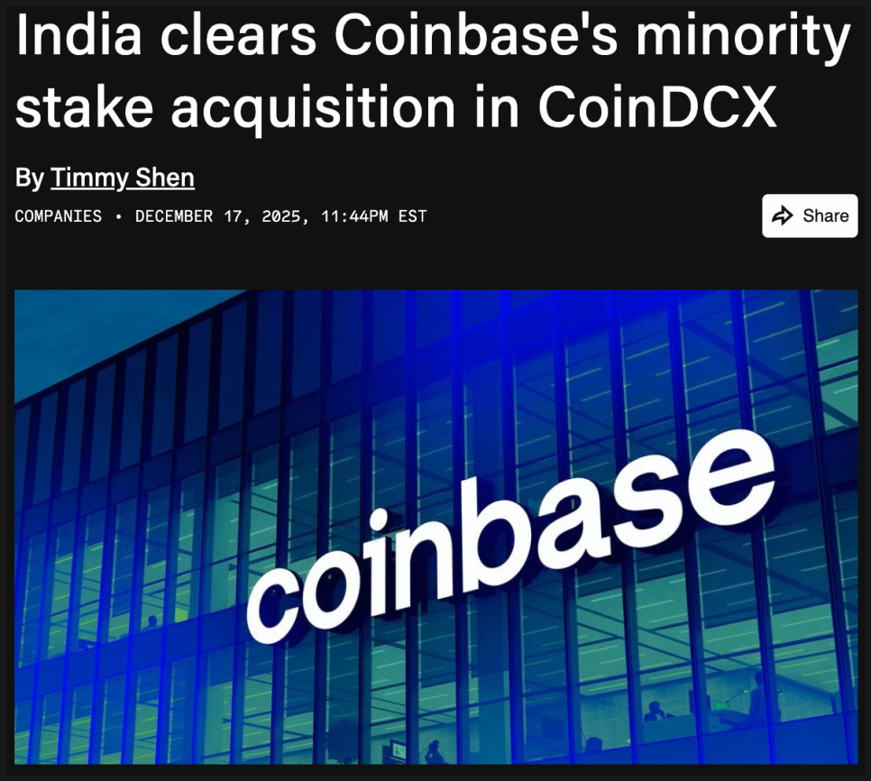 한편 코인베이스(Coinbase)가 인도 최대 암호화폐 거래소 중 하나인 코인디씨엑스(CoinDCX)에 대한 소수 지분 투자를 인도 당국으로부터 공식 승인받았다는 소식도 있었습니다. 인도 경쟁위원회(Competition Commission of India, CCI)가 코인베이스 글로벌(Coinbase Global)의 코인디씨엑스 지분 인수를 승인하면서, 코인베이스의 인도 재진입 전략이 한 단계 더 진전됐다고 볼 수 있습니다.