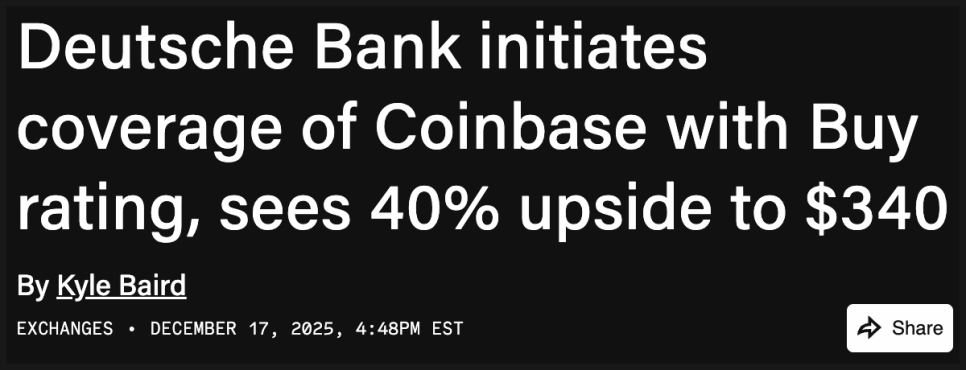 한편 독일계 투자은행 도이치은행(Deutsche Bank)이 코인베이스(Coinbase)에 대해 처음으로 커버리지를 개시하면서 투자의견 ‘매수(Buy)’와 목표주가 340달러를 제시했다는 소식도 나왔습니다. 현재 주가 수준 대비 약 40% 상승 여력이 있다고 본 건데요. 코인베이스가 추진 중인 ‘에브리싱 익스체인지(Everything Exchange)’ 전략이 이제 구호를 넘어 실제 수익 구조로 연결될 가능성이 높아졌다는 판단입니다.