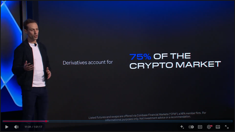예측 시장 이야기가 끝난 뒤, 발표의 분위기는 곧바로 수익성과 직결되는 파생상품 쪽으로 이동합니다. 이때 코인베이스는 전 세계 암호화폐 거래량의 75% 이상이 이미 파생상품에서 나온다는 점을 짚었습니다. 현물 거래 중심 구조만으로는 매출이 시장 상황에 따라 크게 흔들릴 수 있다는 사실을 회사 스스로 인식하고 있다는 의미로 읽힙니다.