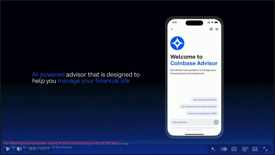 다음으로 코인베이스는 자사가 AI를 어떻게 활용하고 있는지를 코인베이스 어드바이저(Coinbase Advisor)라는 개인 투자 자문 서비스로 설명했습니다. 이 기능의 본질은 사용자가 더 자주, 더 오래, 더 많이 거래하도록 돕는 것인데요. 뉴스 요약과 포트폴리오 추천, 행동 제안까지 연결되는 구조로 거래 전환율을 높이기 위한 전략이라 볼 수 있겠습니다. AI를 통해 사용자가 더 자주 앱을 열고, 더 오래 머물며, 결국 더 많은 거래를 하게 만드는 구조를 만들기 위해서라고 이해하시면 됩니다.