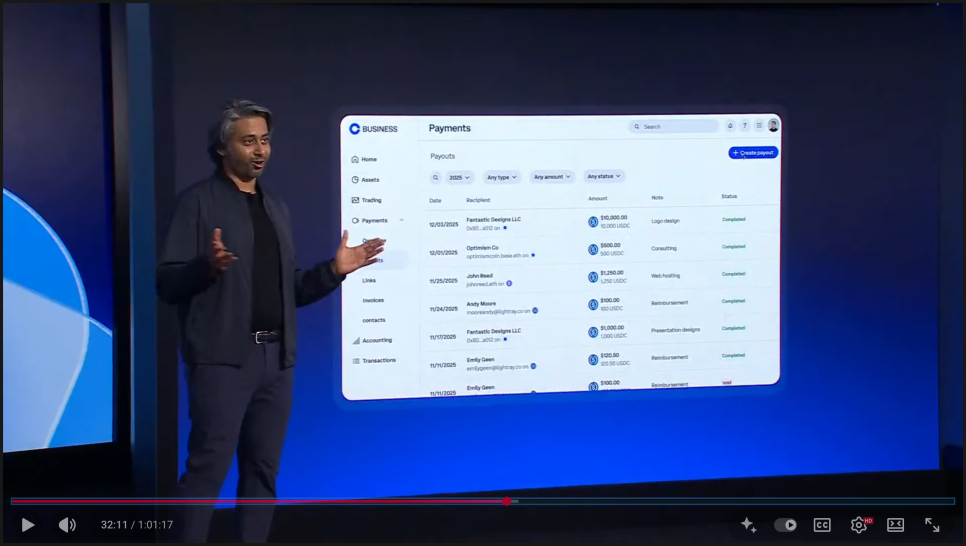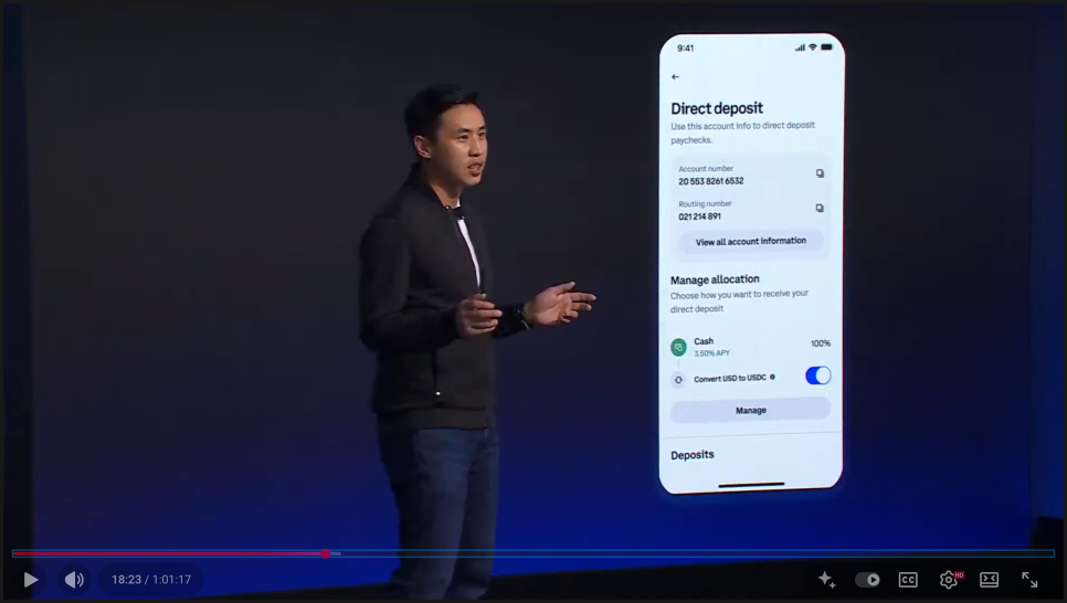 이후 코인베이스는 급여를 코인베이스 계좌로 직접 받는 기능을 시작으로, USDC 예치 보상, 대출, 스테이킹을 차례로 소개했습니다. 코인베이스는 USDC 예치와 대출에서 이미 수십억 달러 규모의 자금이 움직이고 있다고 설명했고, 스테이킹 보상 역시 누적 기준으로 10억 달러를 넘어섰다고 밝혔습니다. 플랫폼 안에서 반복적으로 발생하는 금융 활동이 일정 규모를 넘겼다는 의미입니다.