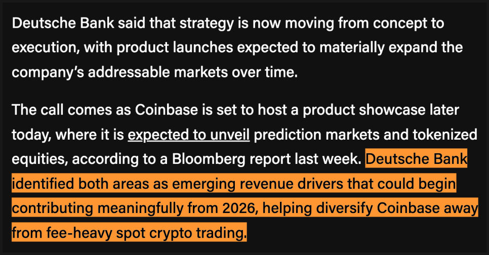 도이치은행의 핵심 논리는 코인베이스의 미래는 더 이상 현물 암호화폐 거래 수수료에만 의존하지 않는다는 점입니다. 주식, 예측 시장, 토큰화 자산, 파생상품으로 거래 영역을 넓히면서 회사가 접근할 수 있는 시장 자체가 크게 확장되고 있고, 이 변화가 2026년부터 본격적으로 실적에 반영되기 시작할 것이라는 분석입니다.