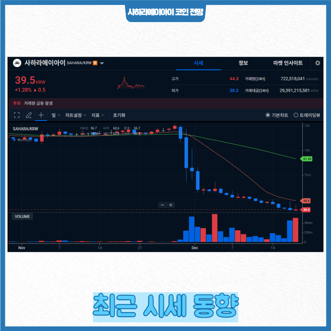 SAHARA는 글로벌 시장에서 변동성이 큰 모습을 보이고 있다. 한동안 급락 흐름이 나타났던 구간도 있었으며, 이는 토큰 언락(락업 해제) 물량 증가가 매도 압력을 강화한 영향으로 분석된다. 이러한 유통 확대는 단기 시세에 부담이 되는 요인으로 작용할 수 있다.