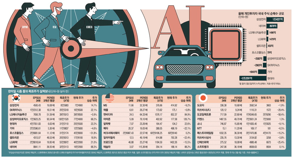 블룸버그 데이터를 통해 목표주가를 산정해보니 미국과 일본에 비해 국내 주식의 주가 상승 여력이 높은 것으로 나타났다. 국내에선 SK하이닉스를 비롯해 삼성바이오로직스, 네이버, 현대자동차 등이 저평가 상태로 나온다.
