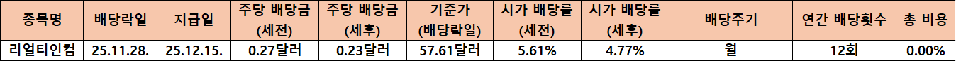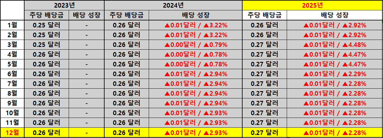 이번 배당 데이터를 보면 주당 배당금은 0.26달러에서 0.27달러로 증가했습니다. 단순히 숫자만 놓고 보면 변화 폭은 매우 작습니다. 한 달 기준으로 체감하기 어려운 수준이라는 점도 부정하기 어렵습니다. 그럼에도 불구하고 이 변화가 중요한 이유는 배당이 하락 없이 이어지고 있다는 사실에 있습니다.