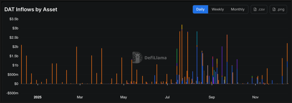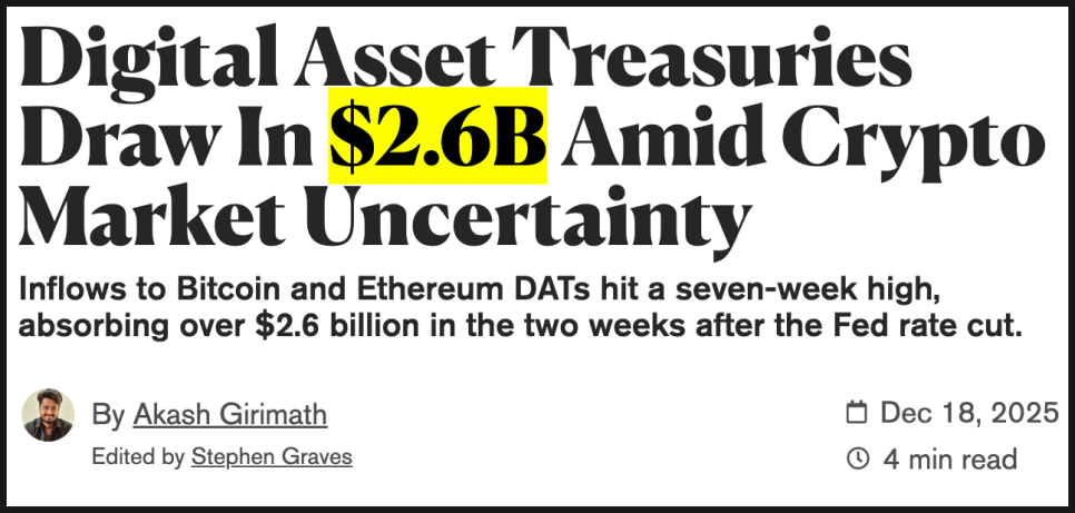 이런 와중에 디지털 자산 트레저리, 즉 DAT 기업들로 기관 자금이 몰리고 있다는 소식이 나왔습니다.