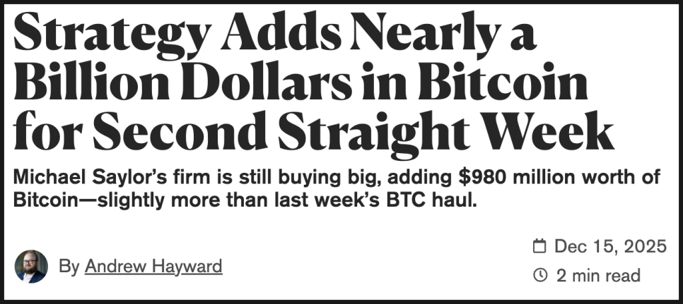 한편 DAT 기업 중 대장주는 비트코인 트레저리 기업 스트래티지가 있습니다. 12월 초와 중순, 스트래티지는 두 차례에 걸쳐 비트코인을 대량 매수했는데요. 단 두 번의 거래로 약 20억 달러에 가까운 비트코인을 추가 확보했습니다. 현재 이 회사가 보유한 비트코인은 약 67만 개 수준이고, 시가로 환산하면 580억 달러가 넘습니다.