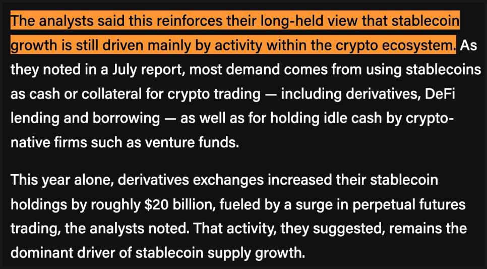 JP모건은 스테이블코인의 주된 수요처를 결제보다는 트레이딩 쪽으로 보고 있습니다. 파생상품 거래, 디파이 대출과 차입, 그리고 크립토 전문 펀드나 기업들이 현금성 자산처럼 보유하는 용도가 여전히 중심이라는 거죠. 실제로 올해 파생상품 거래소들이 보유한 스테이블코인은 약 200억 달러 증가했는데, 이는 무기한 선물 거래가 급증한 영향이 컸다고 분석했습니다.