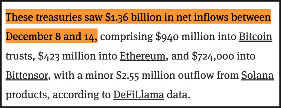 세부 데이터를 보면, 12월 8일부터 14일까지 비트코인 트러스트로 약 9억4천만 달러, 이더리움으로 4억2천만 달러가 들어왔고, 비텐서라는 비교적 소형 자산에도 소규모 자금이 유입됐습니다. 반면 솔라나 관련 상품에서는 소폭 자금이 빠져나갔습니다. 전체적으로 보면 자금이 분산되기보다는, 훨씬 보수적인 방향으로 집중되고 있다는 인상이 강합니다.