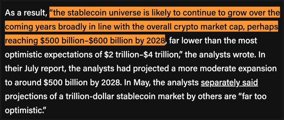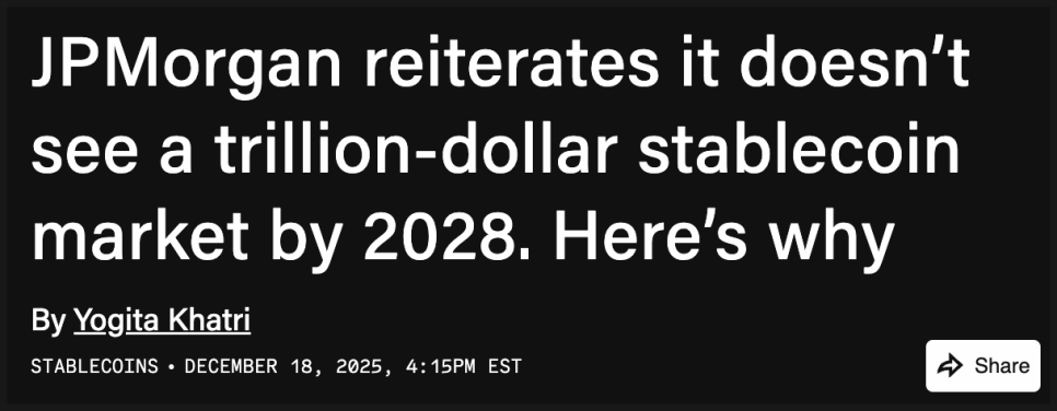 이런 이유로 JP모건은 스테이블코인 시장이 2028년까지 5천억~6천억 달러 정도로 커질 수는 있지만, 일부 기관이 말하는 1조 달러, 더 나아가 2조~4조 달러 전망은 지나치게 낙관적이라고 봅니다. 씨티나 스탠다드차타드처럼 훨씬 공격적인 전망을 내놓은 곳들과는 분명한 온도 차가 있죠.