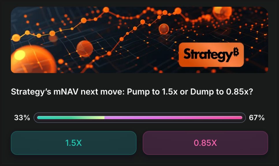 예측시장에서도 분위기는 꽤 보수적입니다. 스트래티지의 mNAV가 1.5까지 회복될 가능성보다, 0.85 수준에 머물 확률을 더 높게 보고 있습니다. 시장 전반의 신중한 시각이 그대로 반영된 결과라고 볼 수 있겠죠.
