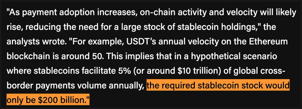 결제 영역 확대에 대해서도 JP모건의 시각은 꽤 냉정합니다. 스테이블코인이 결제에 더 많이 쓰인다고 해서, 반드시 공급량이 크게 늘어나는 것은 아니라는 겁니다. 여기서 핵심 개념이 ‘속도’입니다. 스테이블코인이 얼마나 빠르게 순환하느냐가 중요하다는 건데요. 예를 들어 이더리움 위에서 돌아가는 테더의 연간 회전율은 약 50회 수준이라고 합니다. 만약 스테이블코인이 전 세계 국경 간 결제의 5%, 약 10조 달러를 처리한다고 가정해도, 필요한 스테이블코인 총량은 2천억 달러 정도면 충분하다는 계산이 나옵니다.