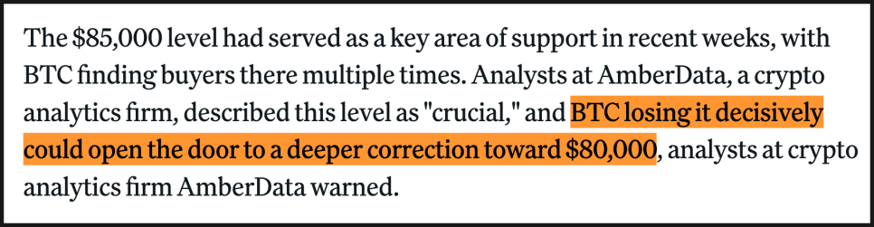 이번에 깨진 8만5천 달러 구간은 최근 몇 주 동안 비트코인이 여러 차례 반등을 시도했던 핵심 지지선이었습니다. 암호화폐 데이터 분석업체 앰버데이터 측도 이 가격대를 상당히 중요한 기준선으로 보고 있었는데요. 만약 이 수준을 명확하게 회복하지 못한다면, 다음 하방 목표로 8만 달러 선까지도 열릴 수 있다고 경고하고 있습니다.