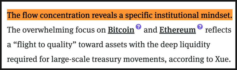 자금이 비트코인과 이더리움에 집중되는 이유도 여기서 나옵니다. 유동성이 크고, 대규모 자금 이동이 가능한 자산이기 때문에 기관 입장에서는 선택지가 제한적이죠. 일종의 안전자산 선호 현상, 다시 말해 암호화폐 시장 내에서의 질적 선호 이동이라고 볼 수 있습니다.