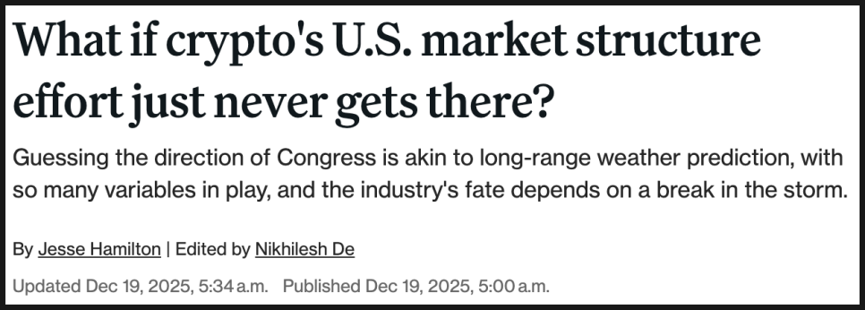 마지막으로 미국 정치 얘기로 마무리하겠습니다. 현재 미국 암호화폐 시장의 규제 방향을 가를 핵심 법안이 상원에 걸려 있지만, 그 결말은 여전히 안갯속이라는 평가가 나옵니다. 업계에서는 기대와 불안이 동시에 커지고 있는 상황인데요.