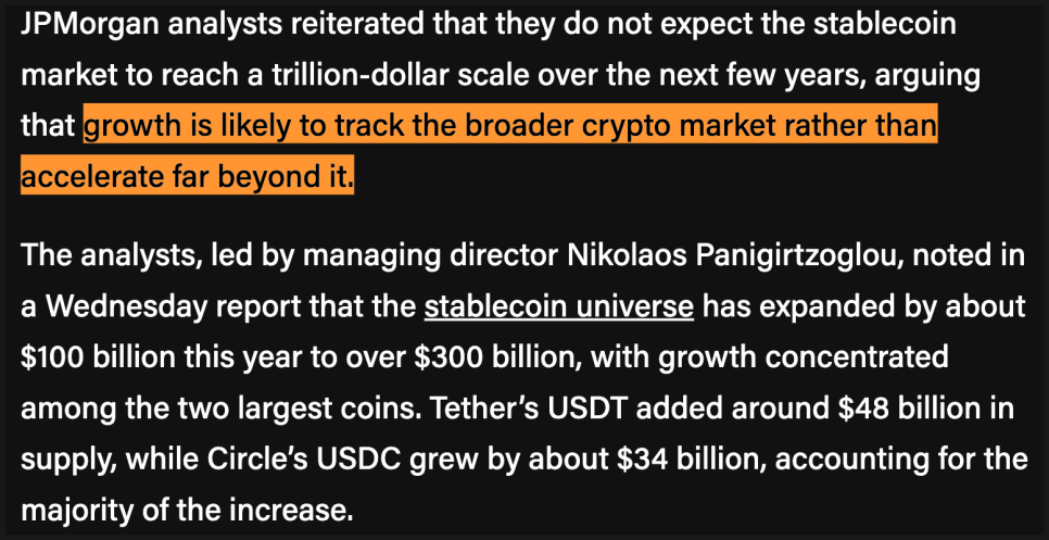 JP모건의 기본 논리는 스테이블코인의 성장은 결국 암호화폐 시장 전체의 성장 속도를 크게 벗어나기 어렵다는 겁니다. 올해만 해도 스테이블코인 전체 공급량은 약 1천억 달러 늘어 3천억 달러를 넘어섰지만, 이 증가분의 대부분은 테더와 USDC 같은 상위 두 종목에 집중됐습니다. 테더는 약 480억 달러, 서클의 USDC는 약 340억 달러가 늘었는데요. 이 자체가 스테이블코인 수요가 여전히 크립토 생태계 내부에 머물러 있다는 증거라는 해석입니다.