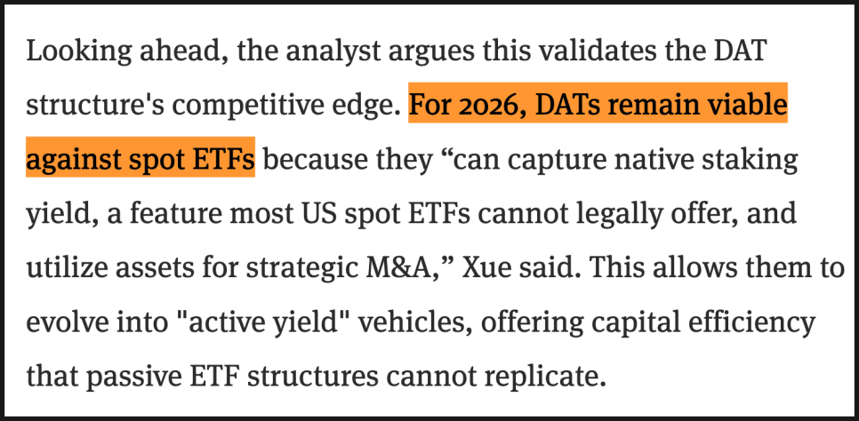 향후 DAT가 암호화폐 ETF와 경쟁할 것이라는 시각도 있는데요. 현물 ETF와 달리 스테이킹 수익을 직접 확보할 수 있고, 보유 자산을 인수합병 같은 전략적 용도로 활용할 수 있기 때문입니다. 이 점에서 DAT는 수동적인 투자 상품이라기보다는, 점점 능동적인 수익 구조로 진화하고 있다고 볼 수 있겠습니다.