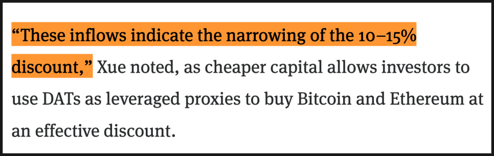 이런 자금 유입은 DAT의 할인율에도 영향을 주고 있습니다. 기존에는 DAT 가격이 실제 자산 가치 대비 10~15% 할인된 경우가 많았는데, 최근 유입으로 이 격차가 점점 줄어들고 있다는 분석입니다. 기관들은 이 구조를 활용해, 사실상 비트코인과 이더리움을 할인된 가격에 레버리지 형태로 매수하고 있는 셈이죠.