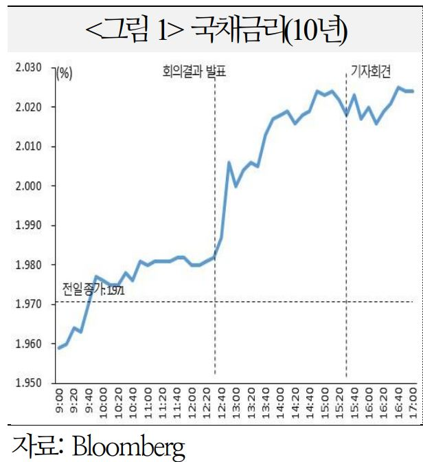 회의 결과는 예상 범위 내였지만 조기 추가 금리 인상을 시사하는 발언은 없었던 만큼 엔화 약세 진행. 국채금리(10년)는 2%를 상회