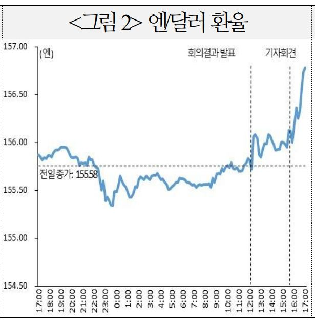 엔/달러 환율은 금리 인상 발표 직후의 반응은 제한적이었으나 기자회견이 진행되면서 약세폭을 확대(155.55엔→156.79엔, +1.24엔)