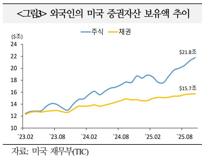 ㅇ 주식 보유액은 $21.8조(9월 대비 +$0.5조), 채권은 $15.7조 (+$460억)로, 5월부터 역대 최고액 기록을 경신 중(총 시장에서 외국인 자금비중은 주식 22%, 채권 27%)