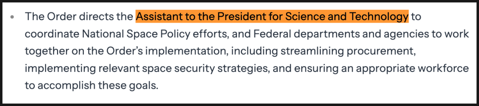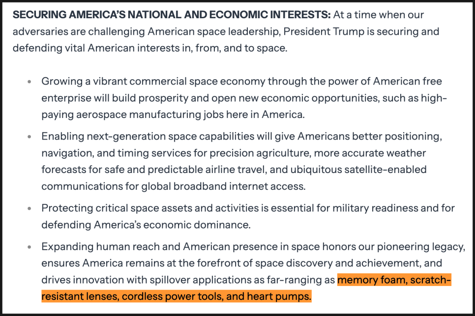 특히 상업 우주 경제를 키우는 것이 미국 내 고임금 항공우주 제조 일자리를 만들고, 새로운 산업 기회를 열 것이라고 강조하고 있는데요. 더 나아가 차세대 우주 기술은 정밀 농업을 위한 위치 정보, 더 정확한 기상 예보, 안정적인 항공 운항, 전 세계 위성 기반 인터넷까지 연결된다고 설명했습니다.