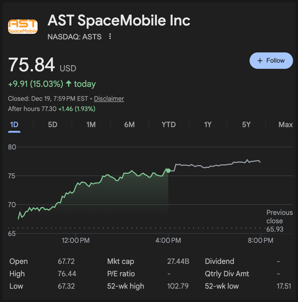 다음은 AST 스페이스모바일(ASTS)입니다. 이 회사는 위성을 통해 일반 스마트폰이 지상 기지국 없이도 직접 통신하게 만들겠다는 그림을 밀고 있고, 성공하면 통신 인프라 판이 커지지만 그만큼 변동성도 큰 종목이죠. 12월 19일 종가는 75.84달러였고, 당일에만 15.03% 상승했습니다.