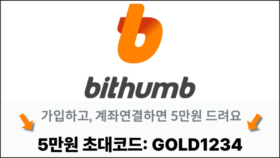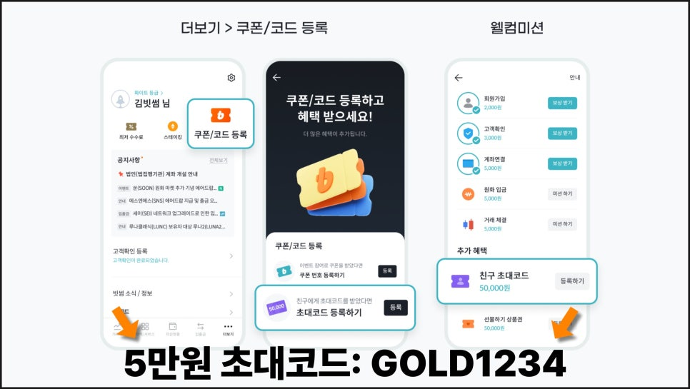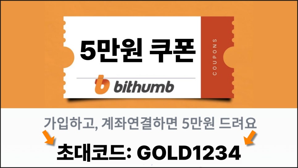 빗썸 앱 가입 후 → 쿠폰 코드 등록 → 친구 초대코드에 GOLD1234 입력.
