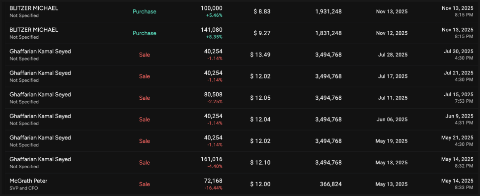 올해 하반기까지 내부자 매도가 발생한 종목인데, 주가가 10 달러 밑으로 떨어진 11월에 내부자 매수가 발생했었습니다. 다만 현재 주가는 내부자 매도가 발생했던 시점보다 높은 점 참고 바랍니다.