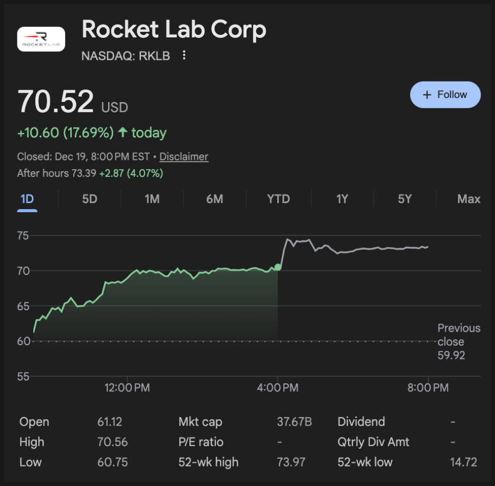 먼저 로켓랩(RKLB)입니다. 로켓랩은 소형 발사체 일렉트론을 이미 상업적으로 반복 발사해온 회사고, 동시에 위성 본체나 우주 시스템까지 함께 다루는 회사인데요. 12월 19일 종가가 70.52달러였고, 하루에만 17.69%가 뛰었습니다.