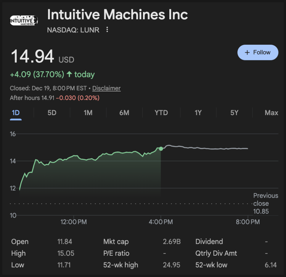 마지막으로 인튜이티브 머신스(LUNR입니다). 12월 19일 종가는 14.94달러였고, 당일에만 37.70%가 급등했습니다. 이 회사는 달 착륙선과 달 수송 같은 사업을 진행하고 있기 때문에, 이번 행정명령에 2028년 달 복귀와 2030년 달 전초기지 같은 문구가 나온 결과 시장이 가장 직관적으로 연결해버린 종목으로 보입니다. 숏커버링이 발생했을 가능성도 있겠습니다.