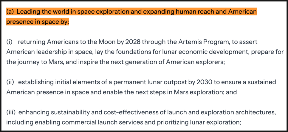 가장 먼저 눈에 띄는 첫 번째 목표는 달 탐사입니다. 이번 행정명령은 2028년까지 미국인을 다시 달에 보내고, 2030년까지는 상설 달 전초기지의 초기 요소를 구축하겠다는 계획을 명확히 제시하고 있습니다. 여기에는 상징 이상의 의미가 있는데, 달 경제 개발, 화성 탐사의 전초기지, 그리고 미국의 지속적 우주 주도권 확보가 동시에 깔려 있습니다. 장기 체류와 운영을 전제로 한 단계로 넘어가겠다는 의미죠.