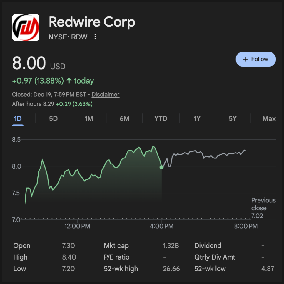다음은 레드와이어(RDW)인데, 12월 19일 종가는 8.00달러였고 당일 13%대 급등했습니다. 레드와이어는 우주에서 필요한 하드웨어와 시스템, 제작 인프라 쪽에 가까운 기업입니다. 우주 산업이 커질수록 반복적으로 돈이 도는 쪽이 공급망이라는 점에서, 정책이 민간 조달을 늘리고 상업 우주 인프라를 강조할 때 같이 묶여서 움직이기 쉬운 타입이죠.