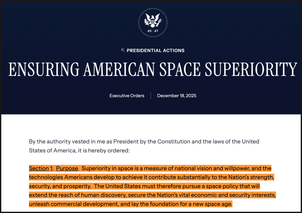 2025년 12월 18일, 도널드 트럼프 대통령이 ‘미국 우주 우위 확보(Ensuring American Space Superiority)’를 골자로 한 새로운 우주 정책 행정명령에 서명했습니다. 미국이 우주 탐사, 안보, 상업 분야에서 세계를 계속 주도하겠다는 ‘미국 우선(America First)’ 우주 전략을 공식화한 문서라고 보시면 됩니다.