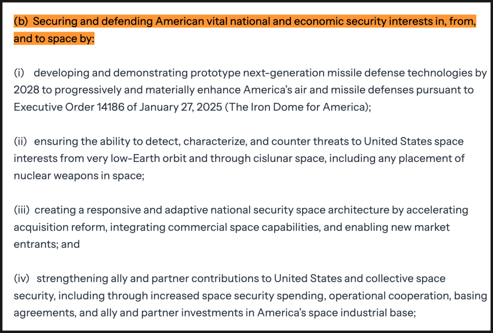 게다가 2028년까지 차세대 미사일 방어 기술의 시제품을 개발하고, 지구 저궤도부터 달 인근 공간까지 미국의 우주 자산을 위협하는 요소를 탐지하고 대응할 수 있는 능력을 갖추라고 지시합니다. 특히 우주 공간에 핵무기가 배치되는 상황까지 명시적으로 가정하고 있다는 점은 상당히 강한 신호입니다.