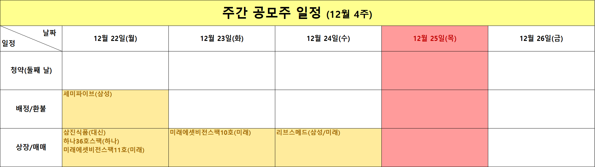 12월의 마지막을 향해 가는 시점에서 12월 4주 차 주간 공모주 일정을 정리해 보았습니다. 연말 특유의 관망 심리와 거래 공백이 공존하는 구간이다 보니 평소보다 일정 하나하나를 더 신중하게 바라보게 되는 시기이기도 합니다. 이번 주는 신규 청약 일정은 없고 배정·환불과 상장 일정 위주로 구성된 한 주라는 점에서 단기 대응 전략의 중요성이 더욱 부각되는 흐름입니다.