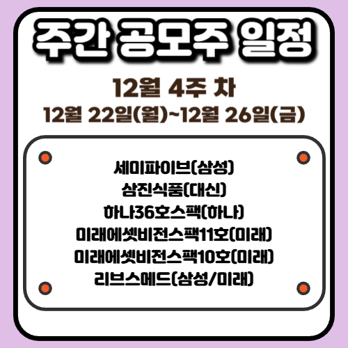 12월 22일 월요일은 이번 주 일정 중 가장 많은 이벤트가 몰려 있는 날입니다. 먼저 배정 및 환불 일정으로는 ‘세미파이브(삼성)’가 예정되어 있습니다. 배정 결과에 따라 계좌 내 예수금 변동이 발생하는 시점이기 때문에 이후 다른 일정과의 자금 배분을 함께 고려할 필요가 있는 구간입니다. 같은 날 상장 일정으로는 ‘삼진식품(대신)’, ‘하나36호스팩(하나)’, ‘미래에셋비전스팩11호(미래)’가 예정되어 있습니다. 특히 스팩 종목의 경우 공모 구조상 큰 스토리를 기대하기보다는 시초가 형성과 초반 거래 흐름 위주로 판단하는 접근이 적절하다고 보고 있습니다. 연말 수급 환경을 감안하면 무리한 기대 수익보다는 안정적인 대응 전략이 우선되어야 하는 구간입니다.