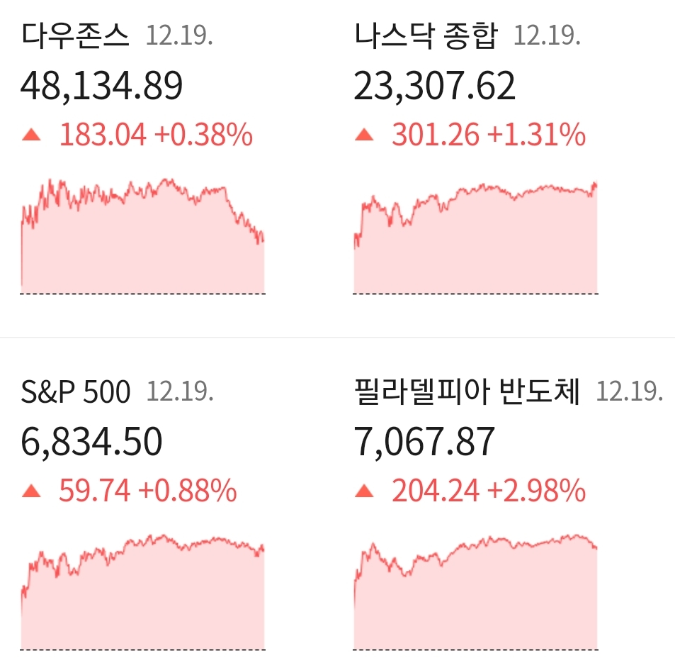 다우지수는 전일 대비 전일대비 +0.38% 오른 48,134.89에 거래를 마쳤으며, 대형주 중심의 S&P500 지수는 전장 대비 +0.88% 상승한 6,834.50에 장을 마감하였습니다. 기술주 중심의 나스닥 지수는 전 거래일 대비 +2.98% 오른 23,307.62에 거래를 마치며 장을 마감하였습니다.