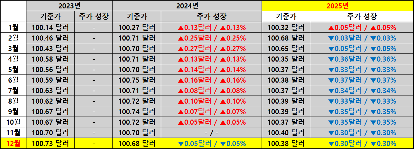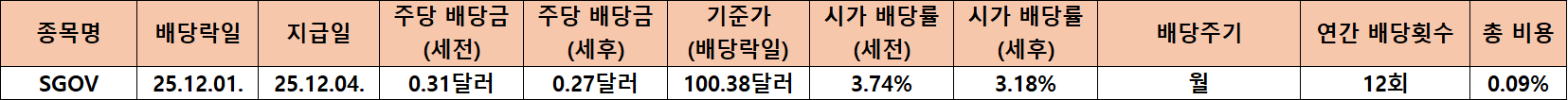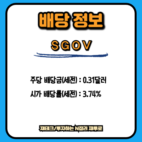 주가 역시 배당락일 기준으로 전년 100.68달러에서 올해 100.38달러로 0.30달러 하락했으며 변동률은 -0.30%에 불과합니다. 주가 흐름만 놓고 보면 SGOV가 본래 의도된 목적대로 가격 안정성을 유지하고 있다는 점이 수치로 확인됩니다.
