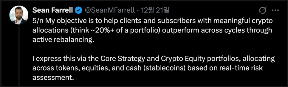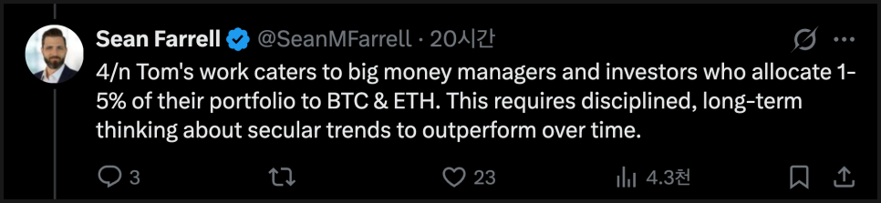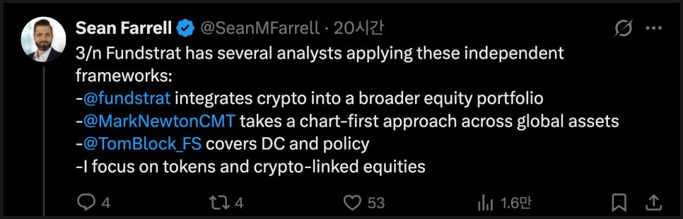 이 지점에서 톰 리와의 차이가 분명해집니다. 션 패럴의 설명에 따르면, 톰 리의 리서치는 비트코인과 이더리움에 포트폴리오의 1~5% 정도만 배분하는 대형 기관 투자자를 주요 대상으로 합니다. 이런 고객층에는 단기 가격 변동보다 장기 구조 변화와 거시 사이클을 보는 접근이 필요하다는 겁니다.