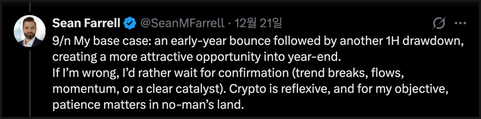 결론적으로 션 패럴의 기본 시나리오는 이렇습니다. 내년 연초 반등이 나온 뒤 상반기에 한 차례 더 조정이 나타나고, 그 이후가 연말을 향한 더 나은 기회가 될 수 있다는 겁니다. 다만 이 시나리오가 틀릴 경우에도, 그는 추세 전환이나 명확한 촉매가 확인될 때까지 기다리는 쪽을 택하겠다고 말합니다.