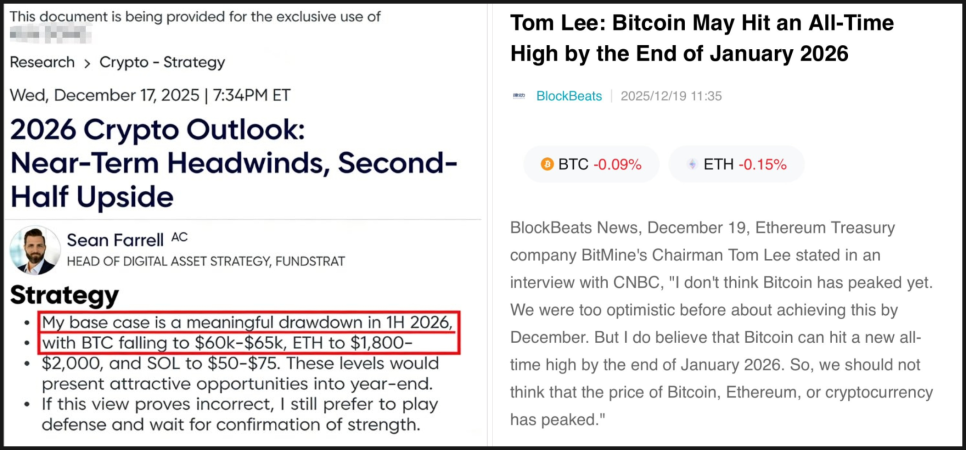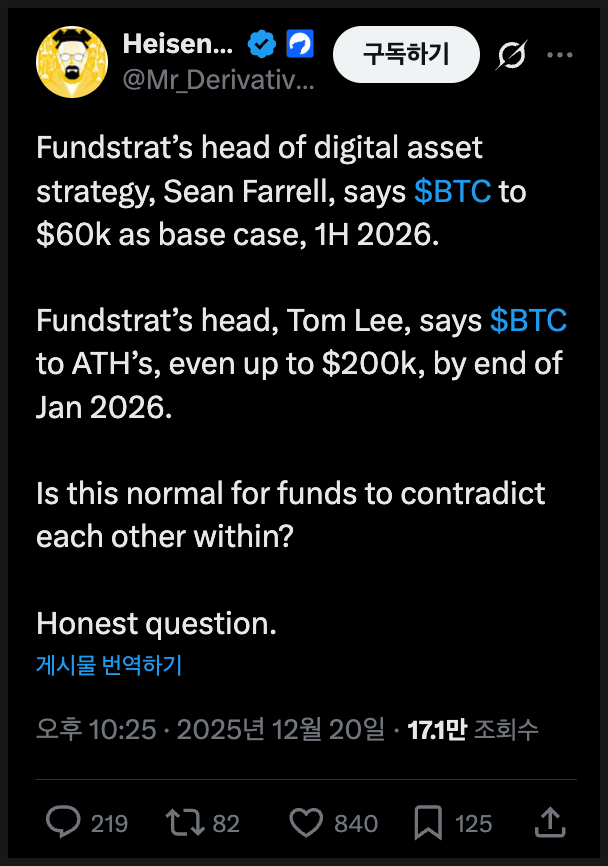 최근 X에서 비트마인 이머션 회장 톰 리와 그의 리서치 회사인 펀드스트랫의 비트코인 전망을 둘러싼 논쟁이 꽤 크게 번졌습니다. 논쟁의 출발점은 펀드스트랫 내부에서 서로 다른 비트코인 전망이 나오는 것처럼 보인다는 지적이었는데요. 일부 이용자들은 펀드스트랫의 공동창업자인 톰 리와 디지털 자산 전략 총괄인 션 패럴의 발언을 나란히 놓고, “같은 회사에서 왜 이렇게 다른 말을 하느냐”는 질문을 던졌죠.