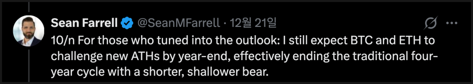 중요한 건 마지막 부분인데요. 션 패럴은 여전히 연말까지 비트코인과 이더리움이 사상 최고가에 도전함으로써 전통적인 4년 주기 패턴을 끝낼 거라고 보고 있습니다. 4년 주기 패턴이 적용됐던 과거와 달리 약세장이 훨씬 더 짧고 얕은 조정으로 끝날 가능성을 이야기하는 거죠.