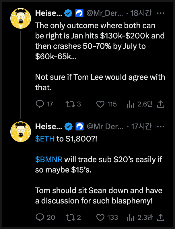 게다가 이더리움이 1,800달러까지 간다는 시나리오가 현실화되면, 이더리움 DAT 기업인 비트마인 이머전 테크놀로지스(BMNR) 주가도 20달러 아래, 심지어 15달러대까지 갈 수 있다며, “이건 거의 신성모독 수준 아니냐, 톰 리가 션을 불러 앉혀야 한다”는 식의 표현까지 썼습니다.