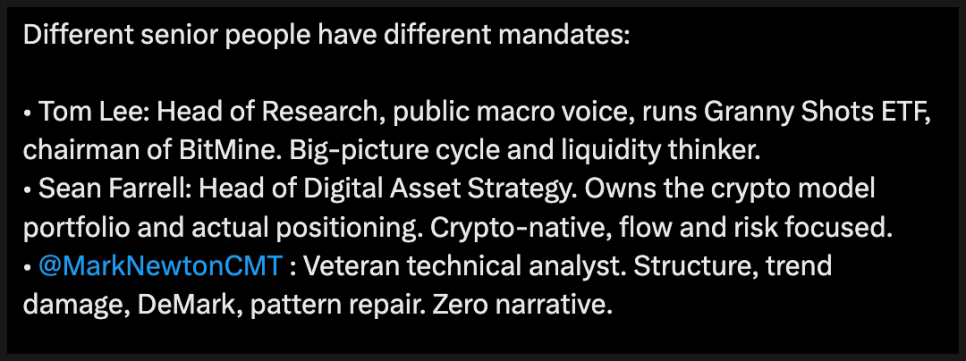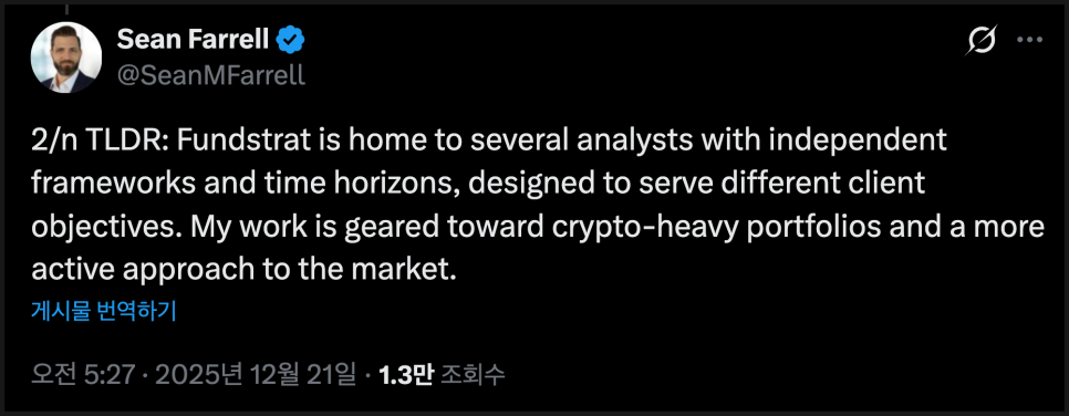 그 다음으로 강조한 것은 펀드스트랫에는 하나의 통일된 전망이 존재하는 게 아니라, 서로 다른 분석 프레임과 시간 축을 가진 애널리스트들이 각자 다른 고객 목적을 위해 일하고 있다는 점입니다. 그는 자신의 역할이 “암호화폐 비중이 매우 높은 포트폴리오”를 위한 액티브 운용에 맞춰져 있다고 분명히 했습니다.